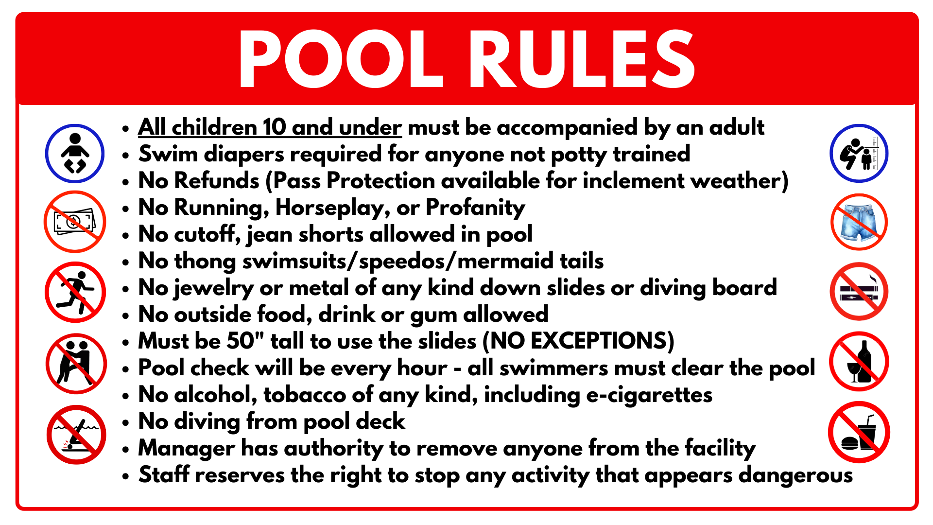Pool check is every hour--patrons must clear the pool during this time (one long whistle)